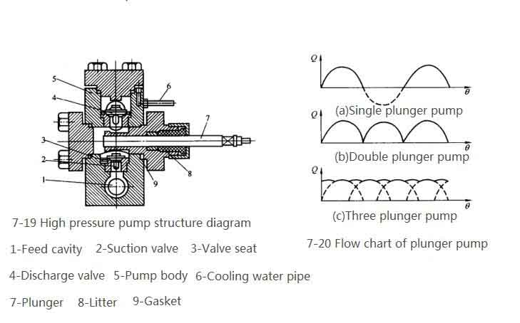 ①结构示意图及工作原理图。7-19为高压泵结构示意图。高压泵为三柱塞泵,由进给腔、吸入阀、排出阀、柱塞组成。工作时,当柱塞向右移动时,腔体体积增大,压力减小,液体推动吸入阀进入泵腔,完成吸入过程。当柱塞向左移动时,腔体体积逐渐减小,压力逐渐增大。关闭吸入阀,打开排出阀,排出腔体液体,完成排出过程。